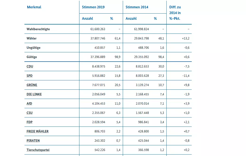 Ergebnisse 2014 & 2019 in Deutschland nach Stimmen